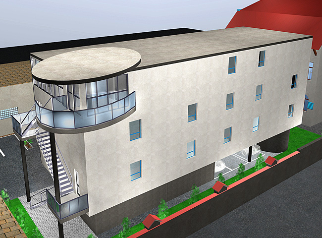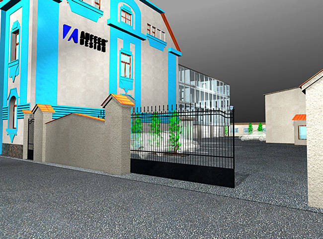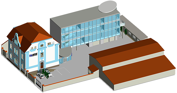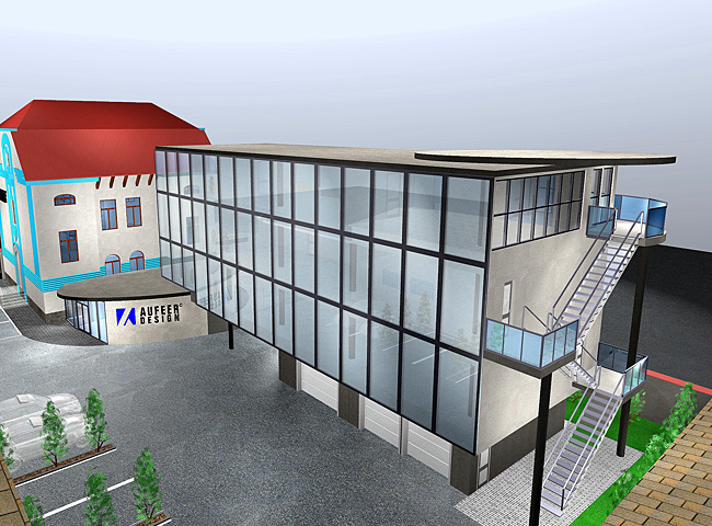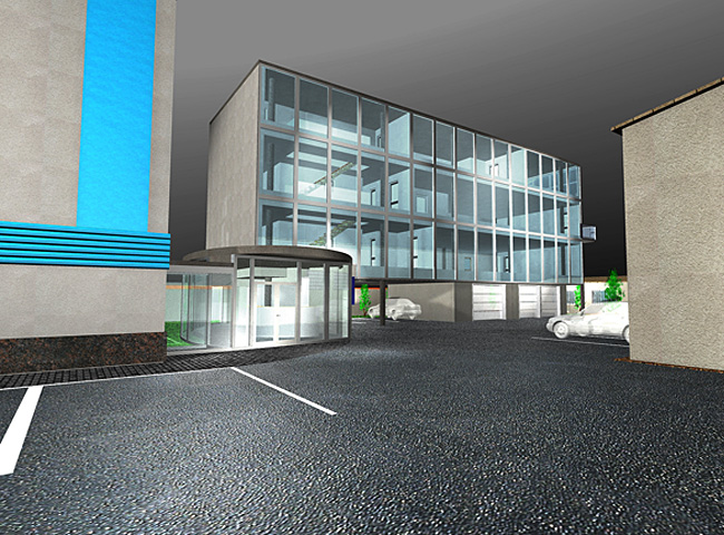 Vizualizace stávajícího sídla firmy s novou přístavbou kancelářských prostor.
